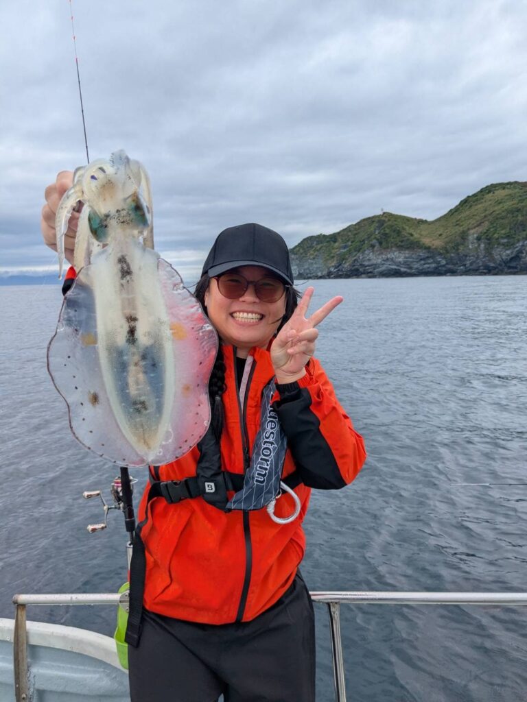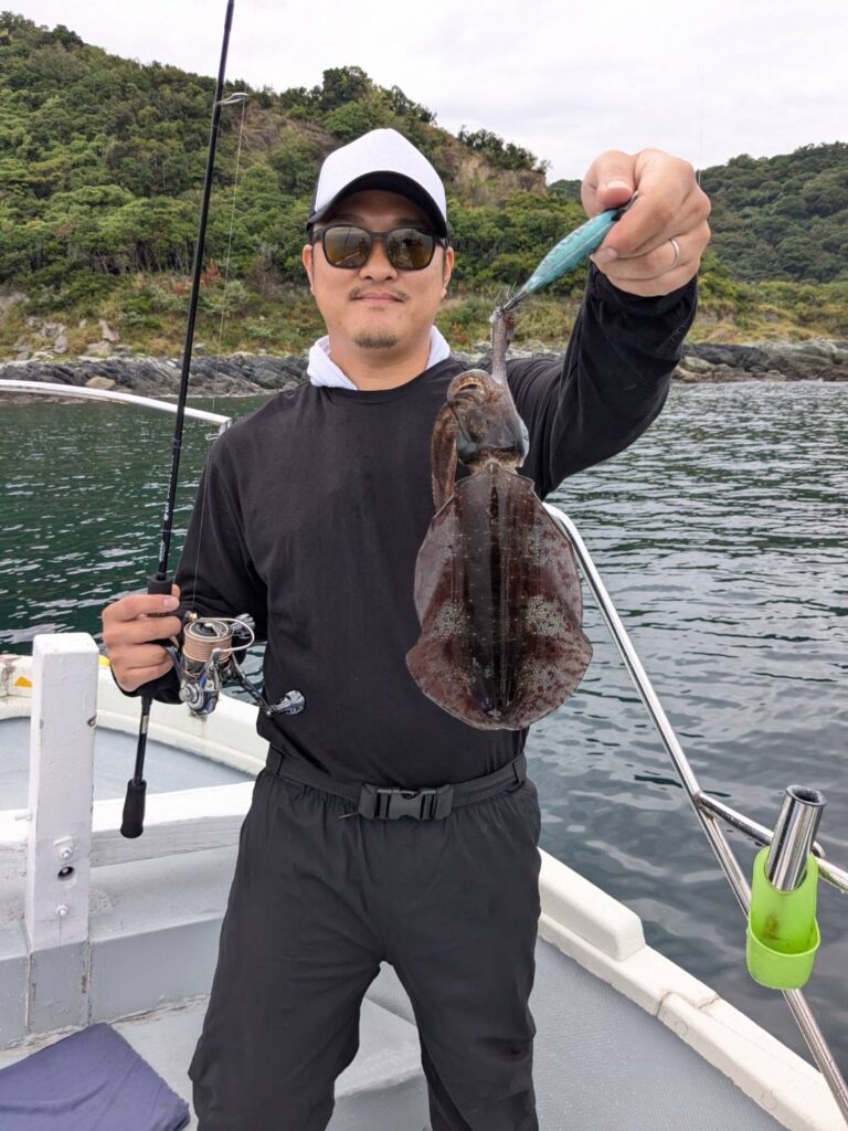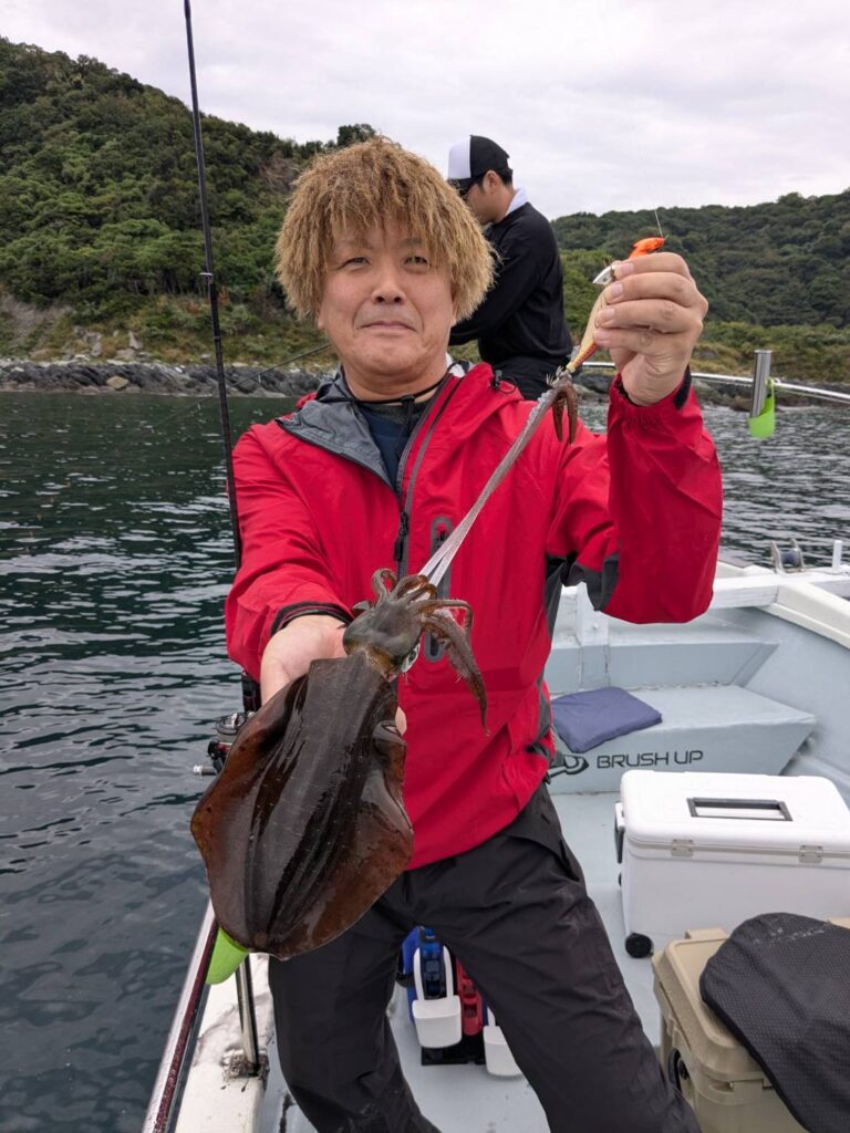 店長ブログ 2025.10.04 10月4日 朝便 ティップラン 本日は、朝から無風で船が流れ無い状況や、雨が降ったり止んだりの中、あの手この手とベテランのお二人が、上手に釣ってくれました٩(^‿^)۶ティップランボウズだった奥さまも、見事ナイスサイズのアオリイカGET! 諦めず、頑張って頂きありがとう御座いました╰(*´︶`*)╯♡ お疲れ様です♪ ありがとうございました(^人^)